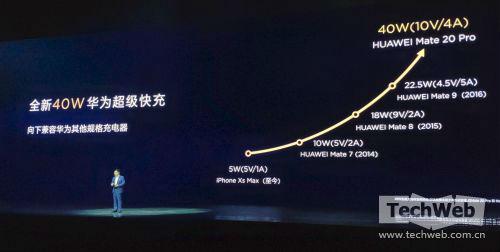 其中華為Mate 20 Pro還支持最高15W的無線充電,無線快充技術要比iPhone XS Max的標準有線充電(5V/1A)快140%,比iPhone XS Max的無線充電(10W)快70%。40W快充技術還通過了德國萊茵TüV權威安全認證。