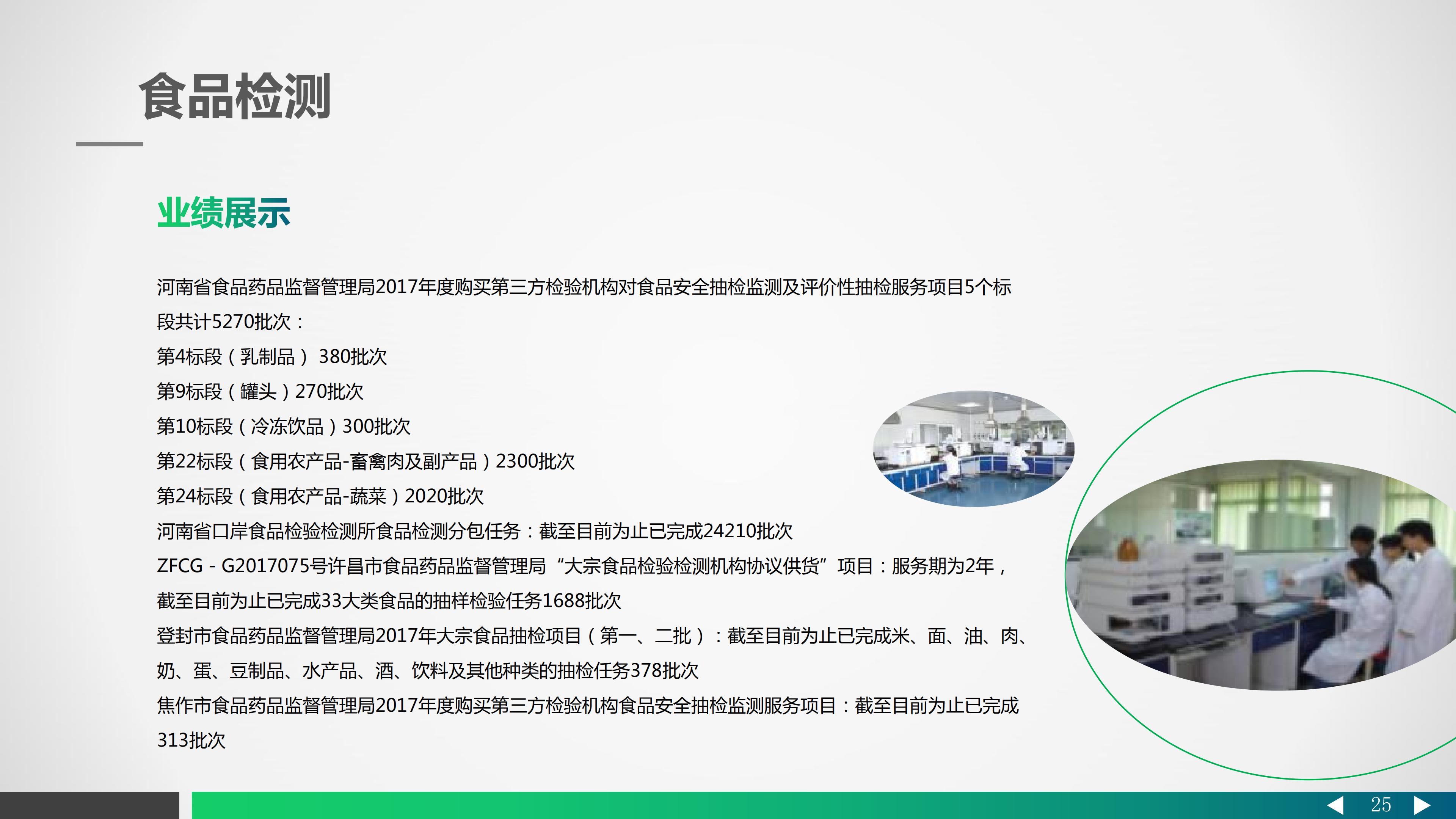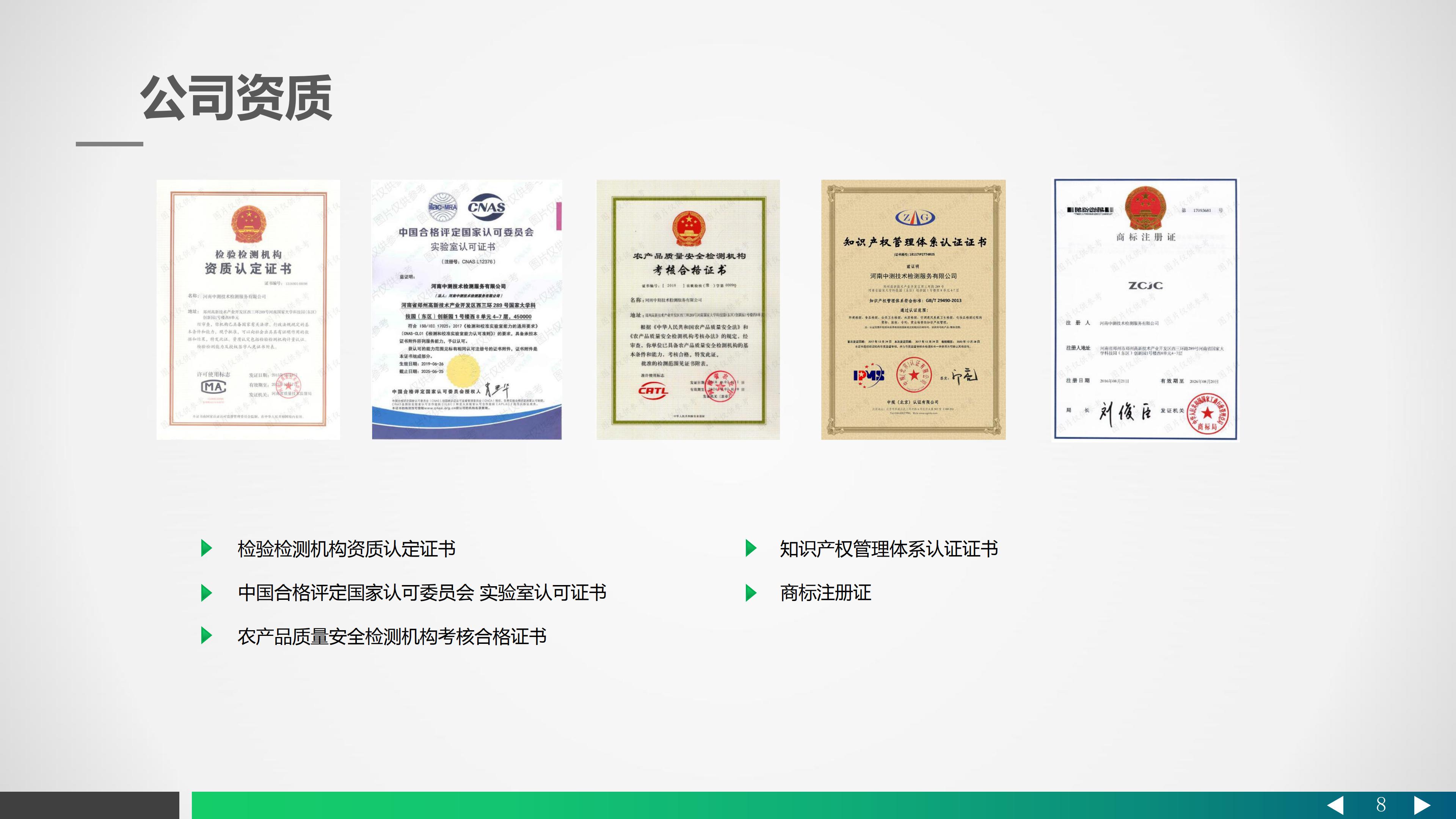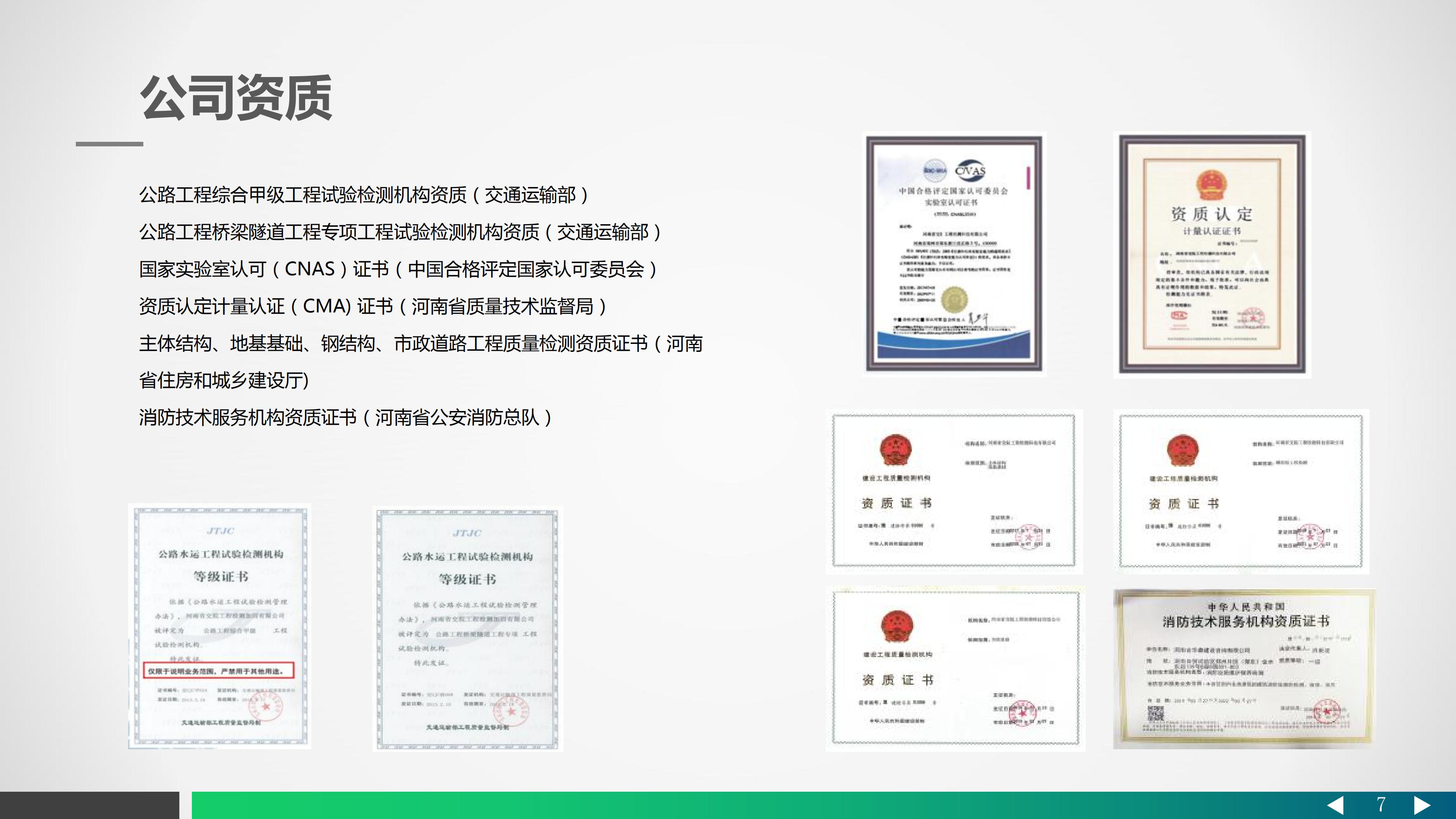 公司擁有先進(jìn)的檢測儀器設(shè)備和一流的技術(shù)團(tuán)隊(duì),完善的質(zhì)量管理體系。先后通過了CMA 、農(nóng)產(chǎn)品及畜牧產(chǎn)品雙CATL、S09001等質(zhì)量資質(zhì)評審、認(rèn)證。公司擁有交通部頒發(fā)的公路工 程綜甲級試驗(yàn)檢測資質(zhì);公路、橋梁、隧道工程專項(xiàng)試驗(yàn)檢測資質(zhì);省住房建設(shè)廳頒發(fā)的取樣、 地基基礎(chǔ)、主體結(jié)構(gòu)檢測資質(zhì)證書。有德國萊茵TUV大中華區(qū)認(rèn)可實(shí)驗(yàn)室,還可檢測農(nóng)藥殘留、 獸藥殘留、添加劑、重金屬、微生物、理化等涉及農(nóng)業(yè)、畜牧業(yè)、食品加工、餐飲、商超、環(huán)境 公共衛(wèi)生等行業(yè)。持有中國合格評定國家認(rèn)可委員會頒發(fā)的實(shí)驗(yàn)室認(rèn)可證書、河南省質(zhì)量技術(shù)監(jiān) 督局頒發(fā)的計(jì)量認(rèn)證證書,通過了IS09001質(zhì)量管理體系、IS014001環(huán)境管理體系 OHSA S18001職業(yè)健康安全管理體系三大管理體系的認(rèn)證、可承擔(dān)檢測項(xiàng)目一千多種。