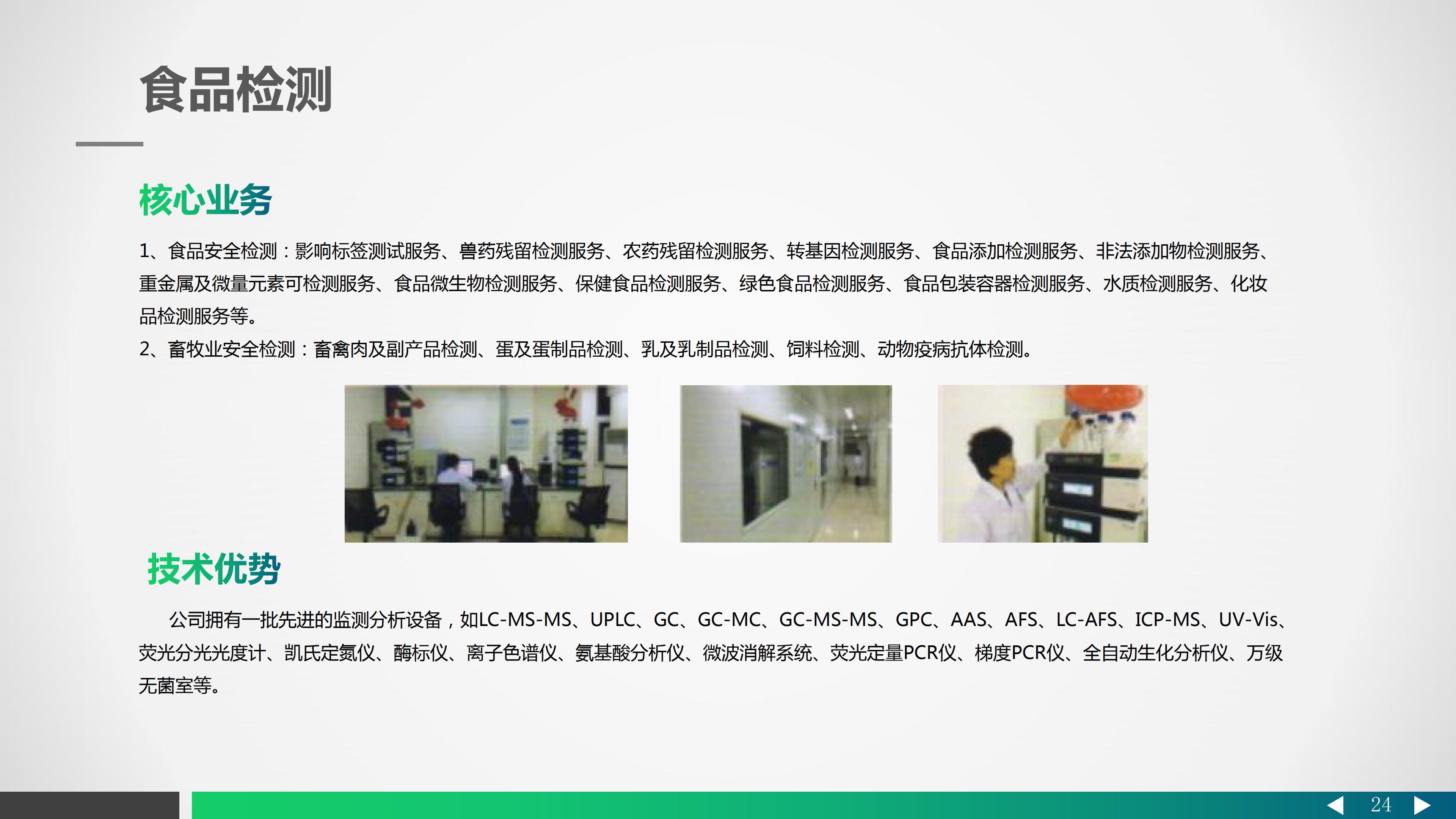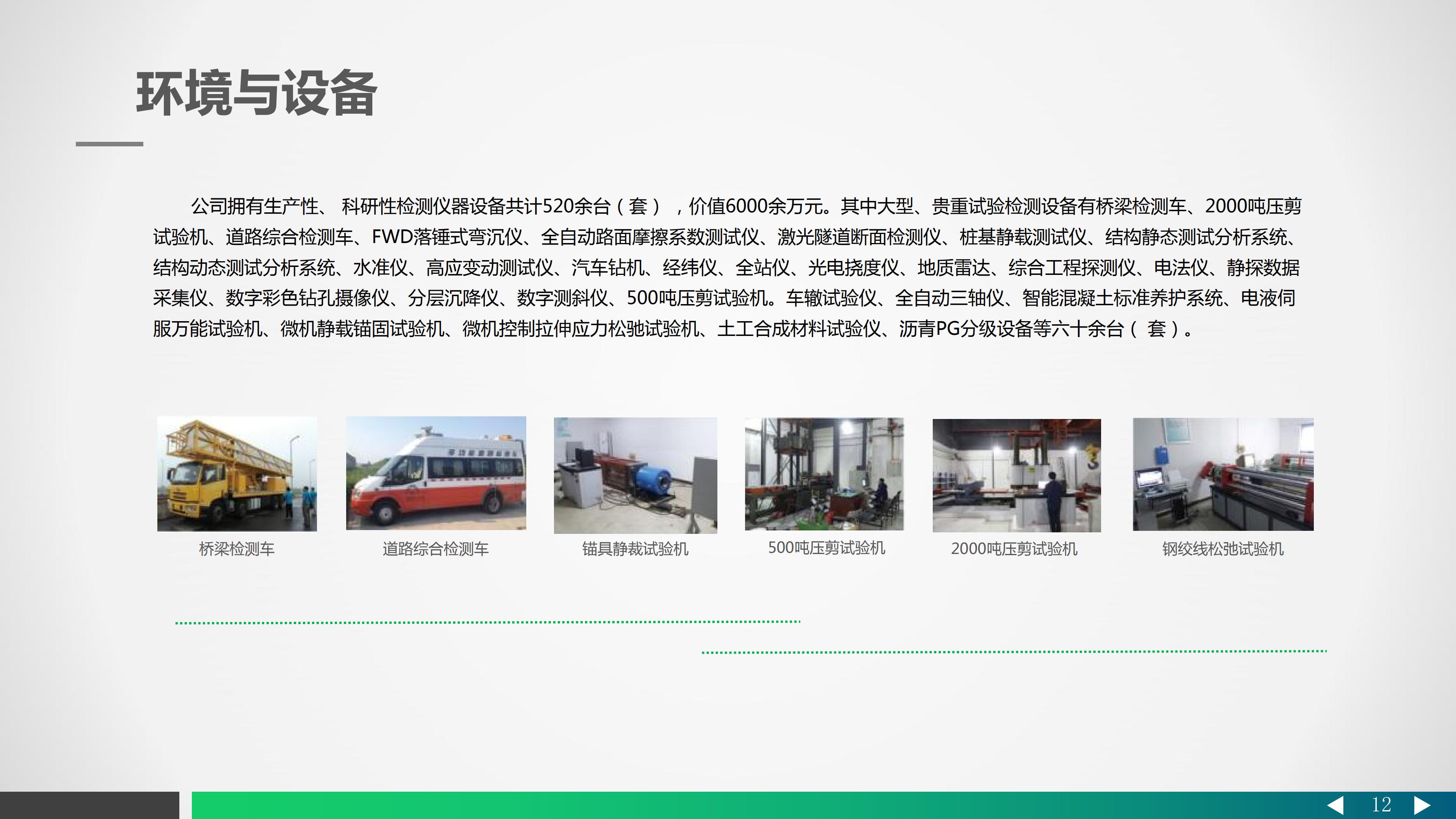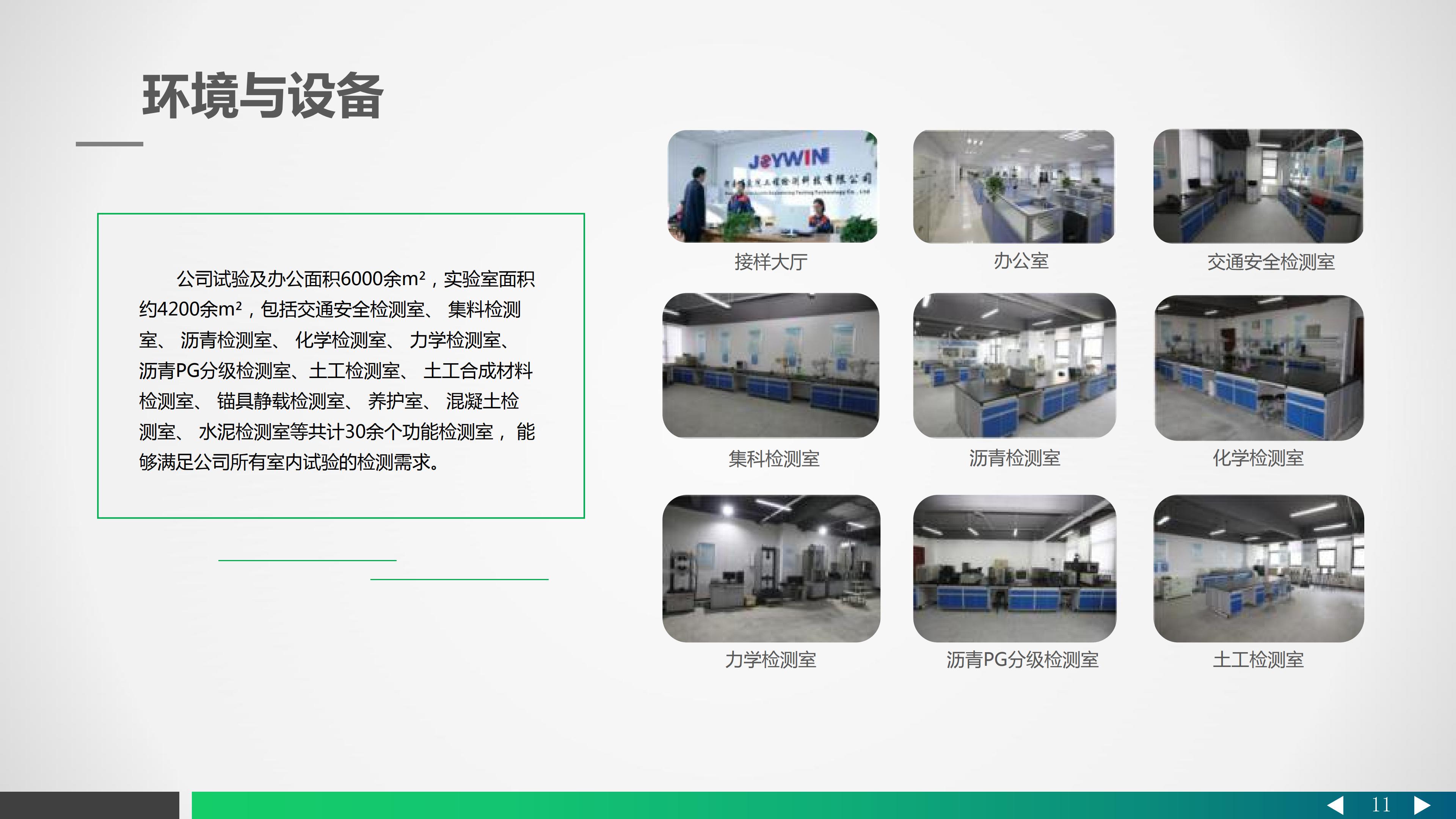 公司擁有先進(jìn)的檢測儀器設(shè)備和一流的技術(shù)團(tuán)隊(duì),完善的質(zhì)量管理體系。先后通過了CMA 、農(nóng)產(chǎn)品及畜牧產(chǎn)品雙CATL、S09001等質(zhì)量資質(zhì)評審、認(rèn)證。公司擁有交通部頒發(fā)的公路工 程綜甲級試驗(yàn)檢測資質(zhì);公路、橋梁、隧道工程專項(xiàng)試驗(yàn)檢測資質(zhì);省住房建設(shè)廳頒發(fā)的取樣、 地基基礎(chǔ)、主體結(jié)構(gòu)檢測資質(zhì)證書。有德國萊茵TUV大中華區(qū)認(rèn)可實(shí)驗(yàn)室,還可檢測農(nóng)藥殘留、 獸藥殘留、添加劑、重金屬、微生物、理化等涉及農(nóng)業(yè)、畜牧業(yè)、食品加工、餐飲、商超、環(huán)境 公共衛(wèi)生等行業(yè)。持有中國合格評定國家認(rèn)可委員會頒發(fā)的實(shí)驗(yàn)室認(rèn)可證書、河南省質(zhì)量技術(shù)監(jiān) 督局頒發(fā)的計(jì)量認(rèn)證證書,通過了IS09001質(zhì)量管理體系、IS014001環(huán)境管理體系 OHSA S18001職業(yè)健康安全管理體系三大管理體系的認(rèn)證、可承擔(dān)檢測項(xiàng)目一千多種。