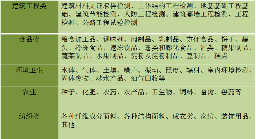 水體、氣體、土壤、噪聲、振動、照度、輻射、室內(nèi)環(huán)境檢測、固體廢物、涉水產(chǎn)品、油氣回收等。