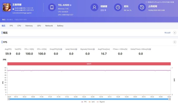 榮耀X10在全高畫質(zhì)下運行《王者榮耀》時,平均幀數(shù)59.9幀,游戲幀數(shù)曲線幾乎是一條直線,雖然曲線中出現(xiàn)了幾次小波動,但是實際游戲體驗相當流暢,幀數(shù)可以保持在60幀左右。