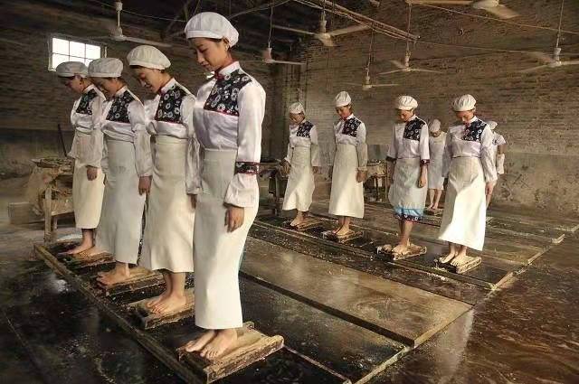 茅臺酒廠制曲是以下面為主要原料,先將小麥粉碎,加入水和“母曲”攪拌,放在木盒子里,工人站在盒子里用腳不停地踩。制曲時間在夏天,制曲車間里的溫度經常高達40攝氏度以上。高溫能消滅一些不良微生物,剩余的有益微生物能產生大量的酶,可以加速淀粉、蛋白質等轉化為糖分。