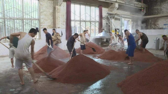 下的高粱需要上甑蒸煮大約兩個小時,然后散在地上“攤涼”,由酒工用鏟子不停地翻開,溫度降至35攝氏度左右開始加曲。上滿一甑需要高粱1500斤,第一次加入約220斤左右的酒曲。高粱與酒曲的總體比例為1∶1,用的曲量是特別大,但是酒曲要分9次加入,每次加的數量都不一樣,平均為高粱的10%上下。