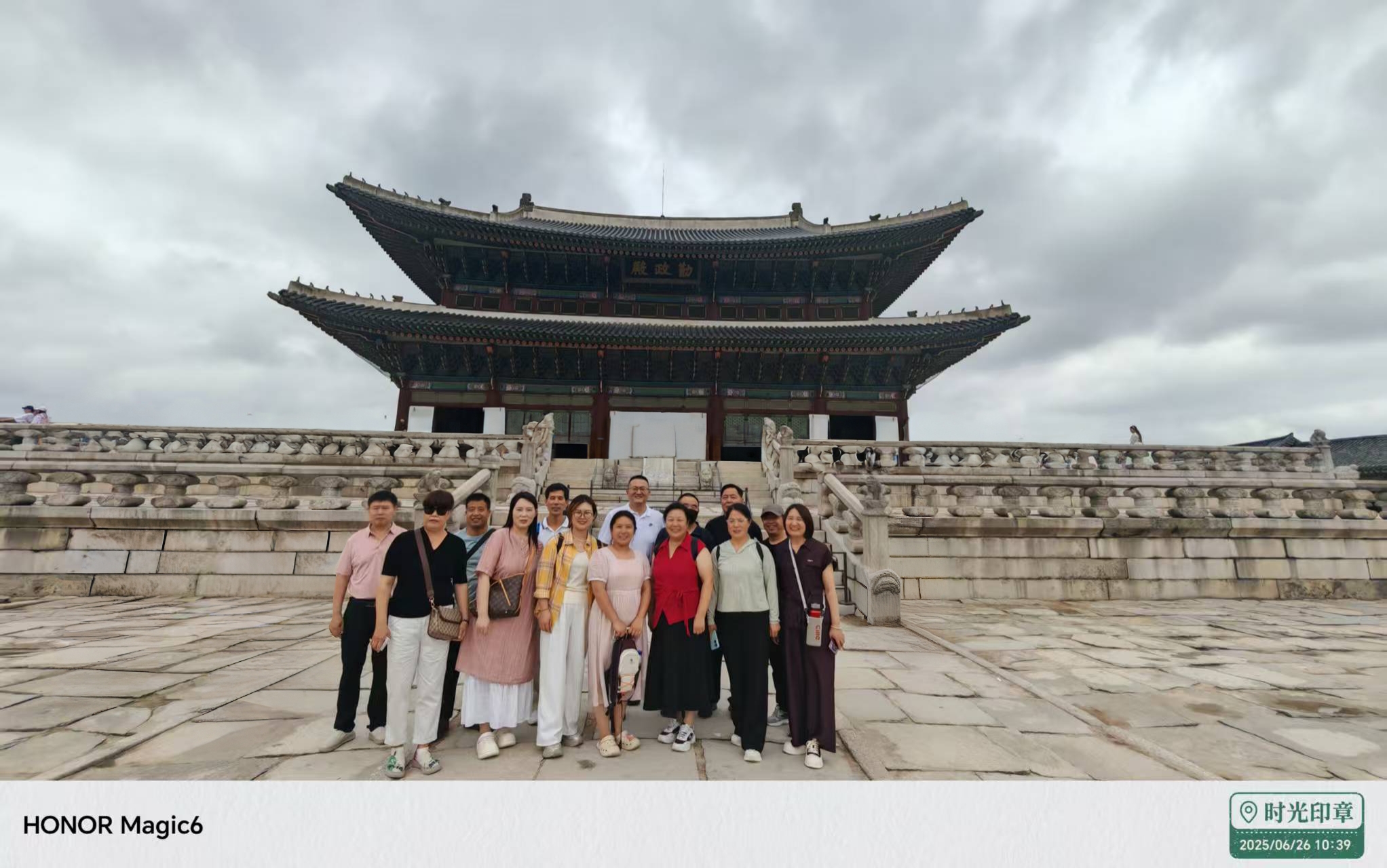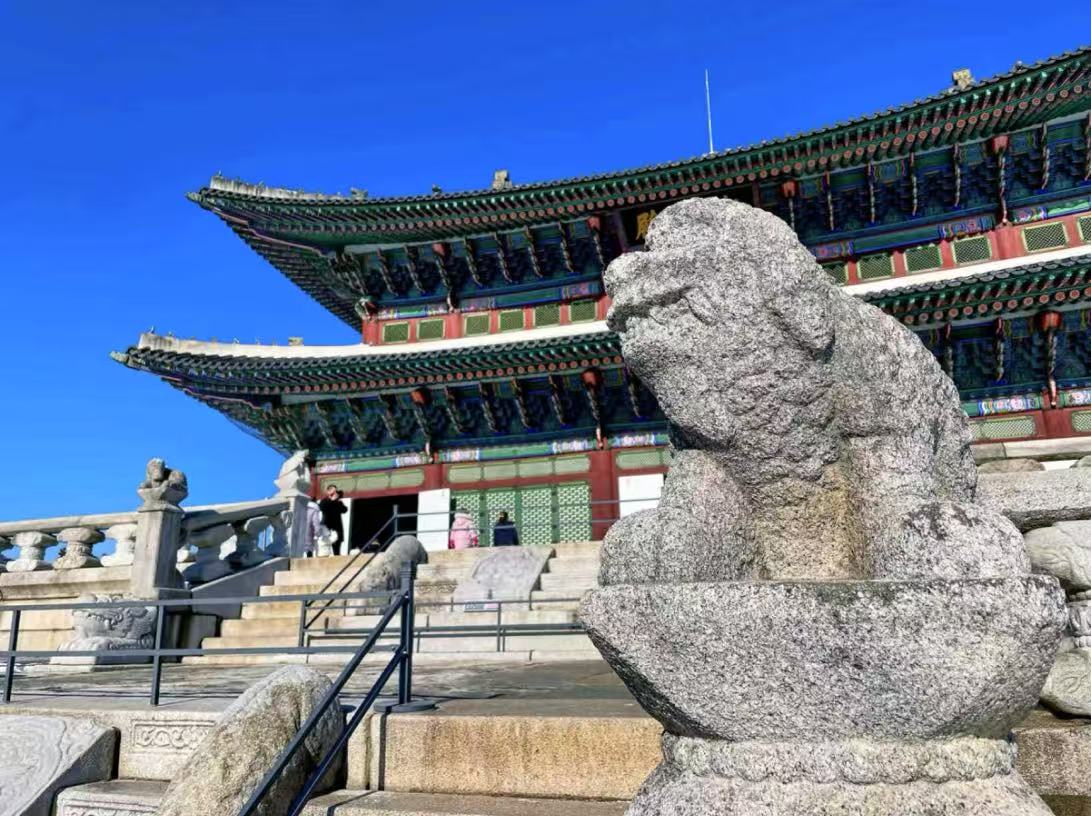 首爾之行的首站,團(tuán)隊(duì)跟隨旅游團(tuán)走進(jìn)世界文化遺產(chǎn)景福宮。在專(zhuān)業(yè)導(dǎo)游的講解下,青瓦白墻的宮殿群仿佛被賦予生命:勤政殿的威嚴(yán)、慶會(huì)樓的雅致、香遠(yuǎn)亭的精巧……團(tuán)隊(duì)成員漫步其中,沉浸式感受朝鮮王朝的興衰變遷。