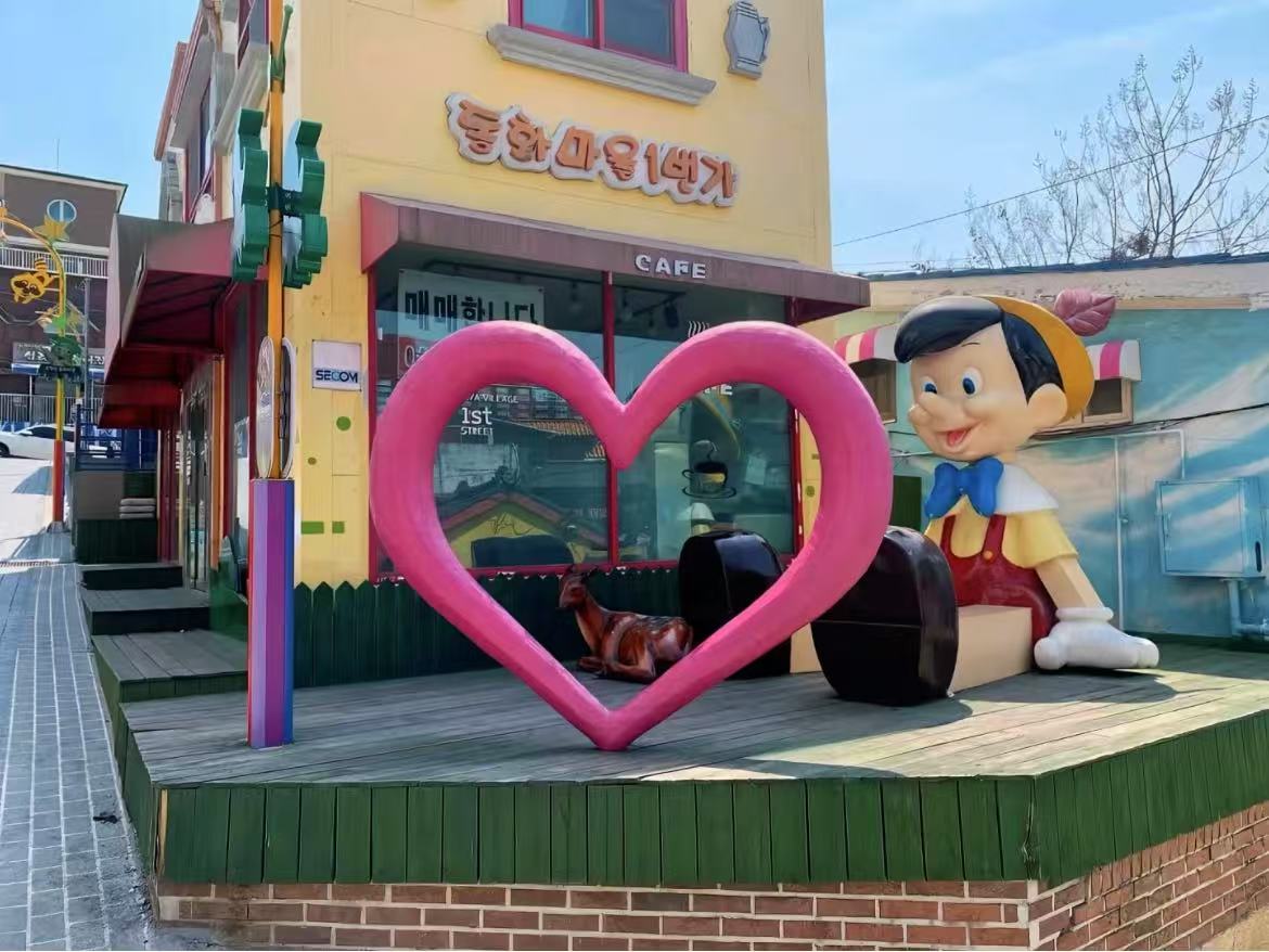 位于仁川站附近的松月洞童話村,曾是破敗的老舊社區(qū)。經(jīng)政府改造后,斑駁的墻面被涂滿童話壁畫(huà):彩虹城堡、精靈森林、卡通動(dòng)物躍然其上,五彩斑斕的街道宛如童話王國(guó)。